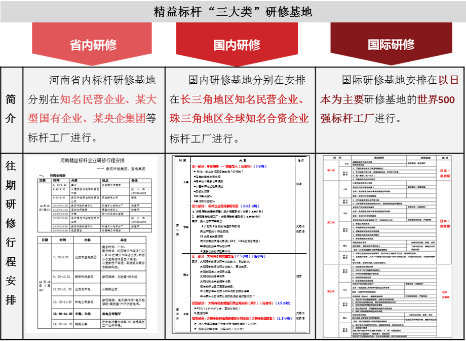 戴明咨詢可爲客戶(hù)提供“三大類(lèi)”精益研修基地 ,按照區域區分爲:河南省内、珠三角&長(zhǎng)三角地區以及國(guó)際研修,企業客戶(hù)可根據(jù)需求定制專屬企業研修行程。