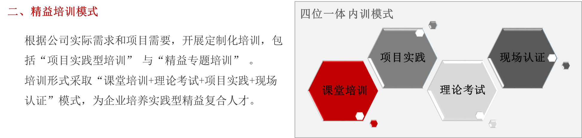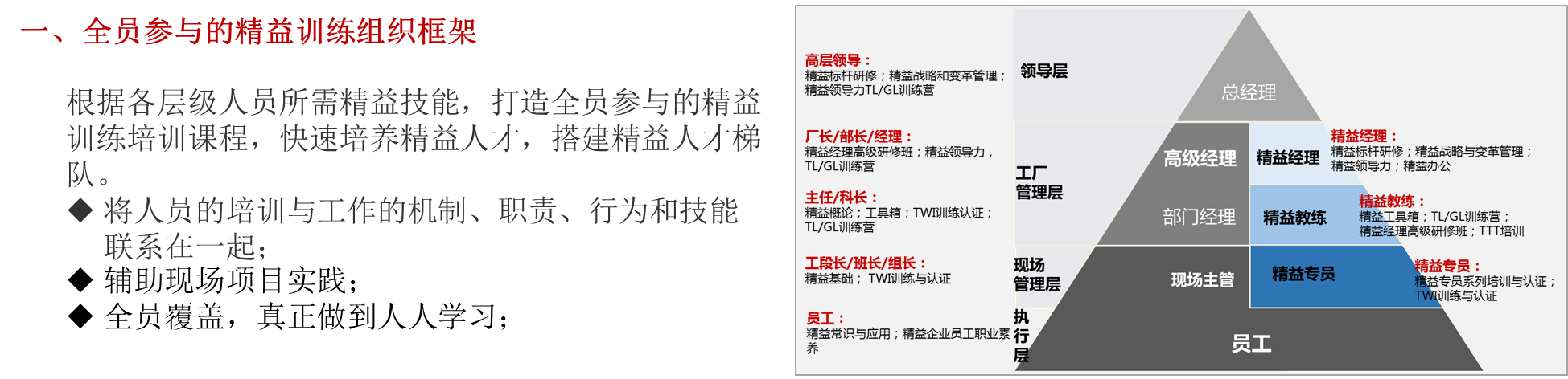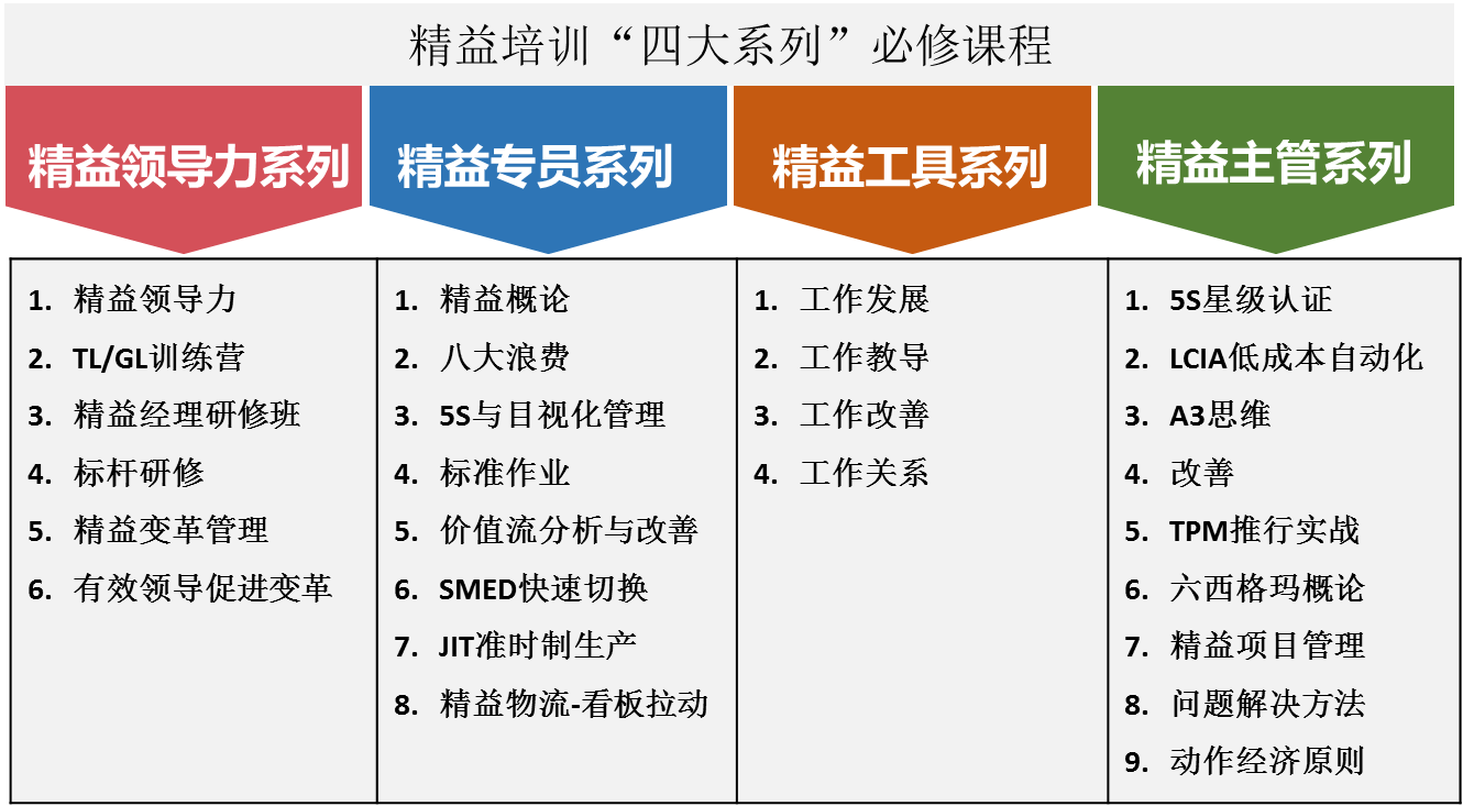 戴明精益管理培訓“四大系列”必修課程是企業推動(dòng)精益轉型過程中必修的精益理念、工具、系統和變(biàn)革能力,戴明咨詢爲企業提供行業的精益實戰必修課程,爲企業内部選擇和開發課程節約時間,並(bìng)確(què)保企業獲得高質量的精益培訓資料,爲企業快速培養精益人才,搭建精益人才梯隊。