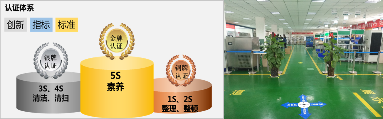 5S認證體系特點 :創新:總結國内企業推行經驗,借鑒質量體系認證做法,總結提煉而成。标準:将5S活動标準化,量化實施步驟,推行過程會涉及推行程序、手法、使用表格等。三變:規範5S活動,達到現場變、績效變、人員變。考核:通過方法培訓、認證前輔導、認證、再評審再輔導、考核、以督促、規範5S活動的展開、提升員工參與5S活動的積極性。