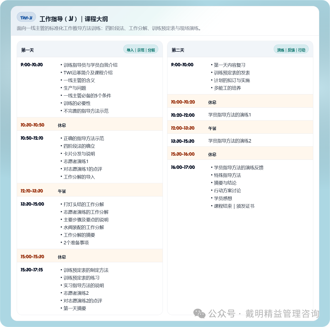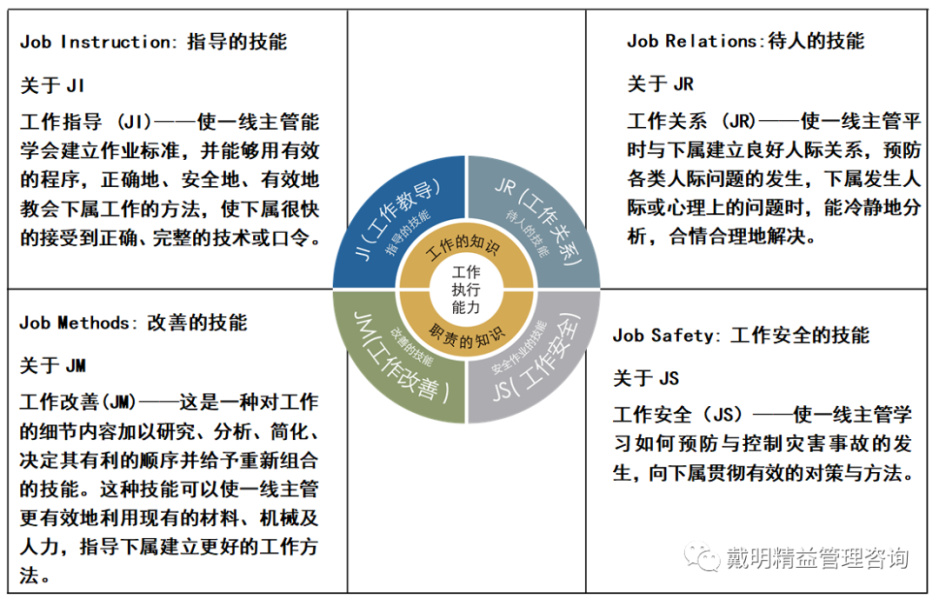 TWI(Training Within Industry),即爲督導人員訓練,或一線主管技能培訓,其源於(yú)二戰後,美國生産局重建日本經濟。1950年TWI首次登陸日本,率先在豐田、日産、東芝、三菱等企業全面展開。1955年起日本政府指定由日本産業訓練協會(簡稱日産訓)負責推動,将TWI作爲現場管理者必修的課程。至今在日本已有超過1000萬名現場管理者接受瞭(le)TWI培訓。如今,不僅在日本,TWI已經成爲歐美、韓等各國及地區公認的一線主管有效的技能發展課程。