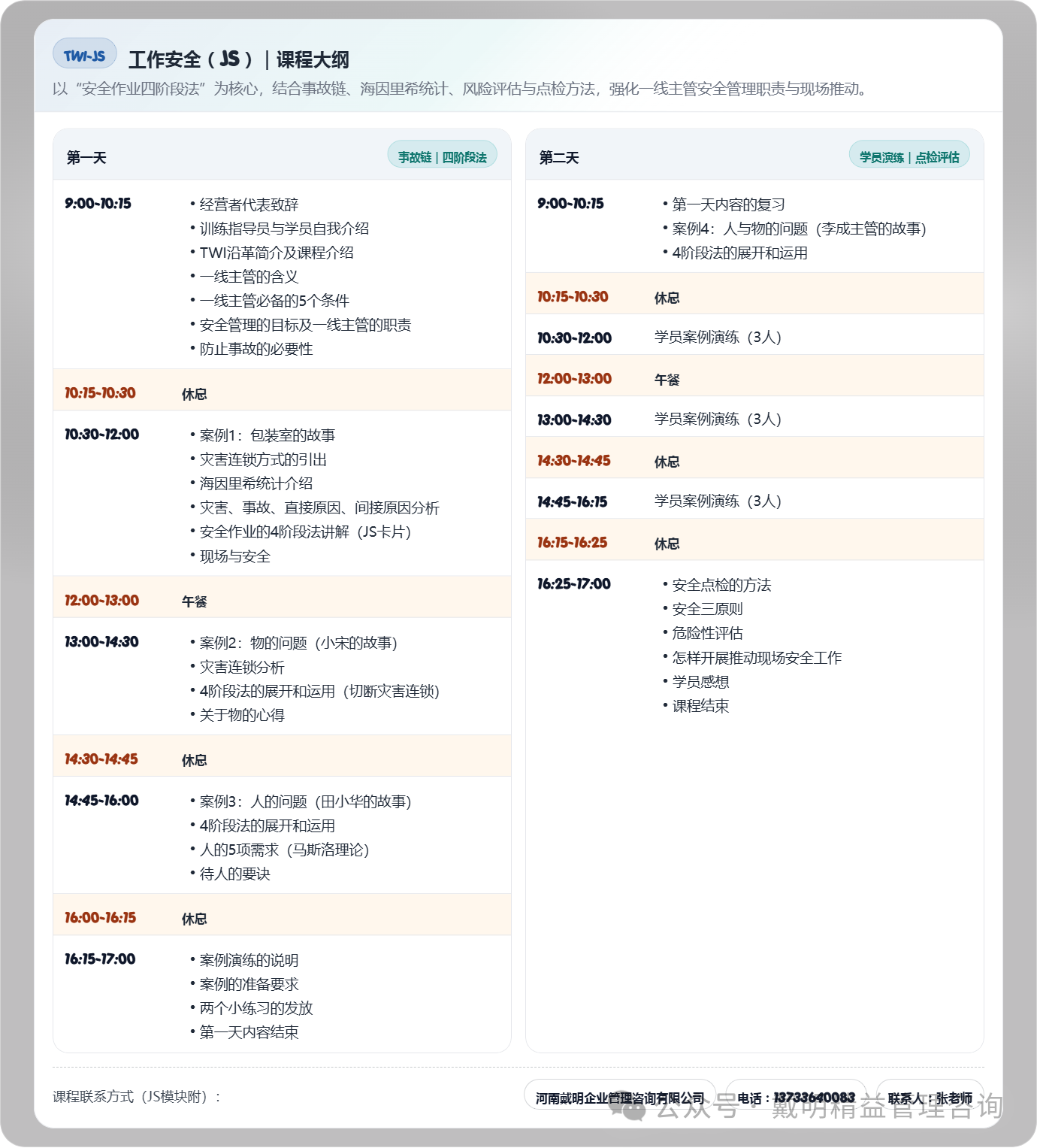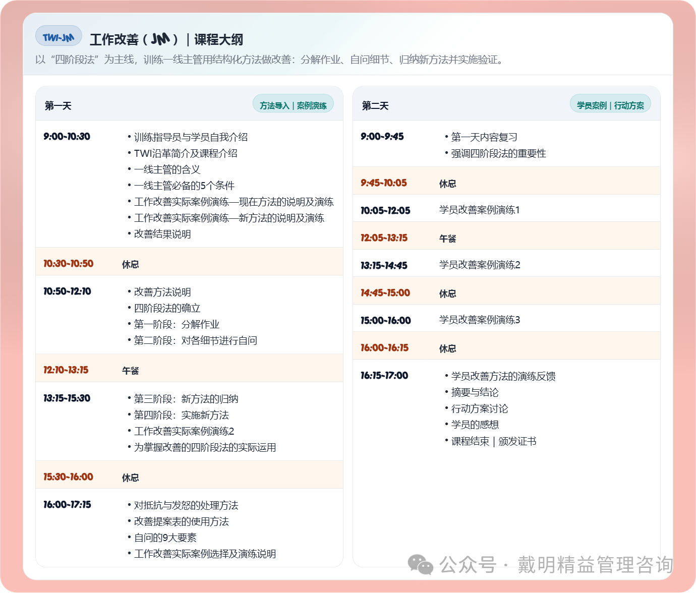 1、原汁原味引進。原汁原味引進源自日本的經典TWI課程,高度的标準化、定制化 ,一線主管接受培訓後(hòu)很容易推廣(guǎng),更容易接受。