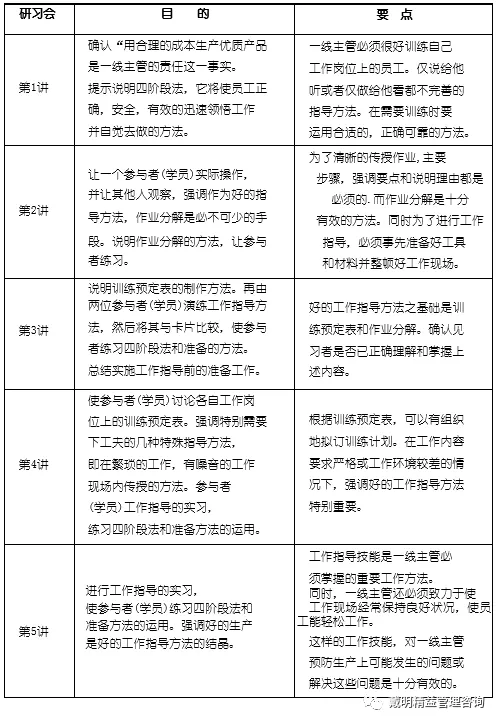JI是爲瞭能使一線主管掌握一套(4階段法)正確地,安全地,有效地指導員工作業的技能。員工不遵守标準作業是現場的一大難題,一線主管必須能掌握一套正確指導的技能讓員工能在理解的基礎上嚴格遵守标準作業。使用4階段法進行正確的指導又需掌握並能運用[作業分解]來解決指導中的不規範性與錯誤,能使自己在今後的指導工作時形成指導的标準。達到正確地指導工作,並能讓部屬迅速領悟工作,並且不出差錯的進行标準作業。