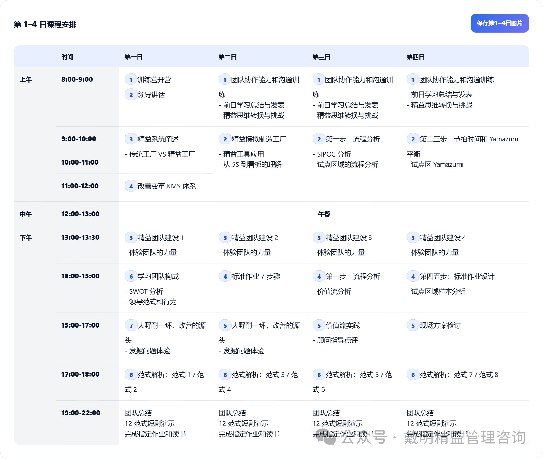 不是“聽課”,而是“帶你練出來”:每天包含總結發表、團隊訓練與複盤,強調(diào)行爲改變(biàn)